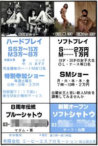 Akasaka Blue Chateau is an SM club operating from 1980-1987. Created by Mary Aoi in 1980 and located in Akasaka 2-Chome, it hosted SM shows about once per week with appearances by Eikichi Osada and others.